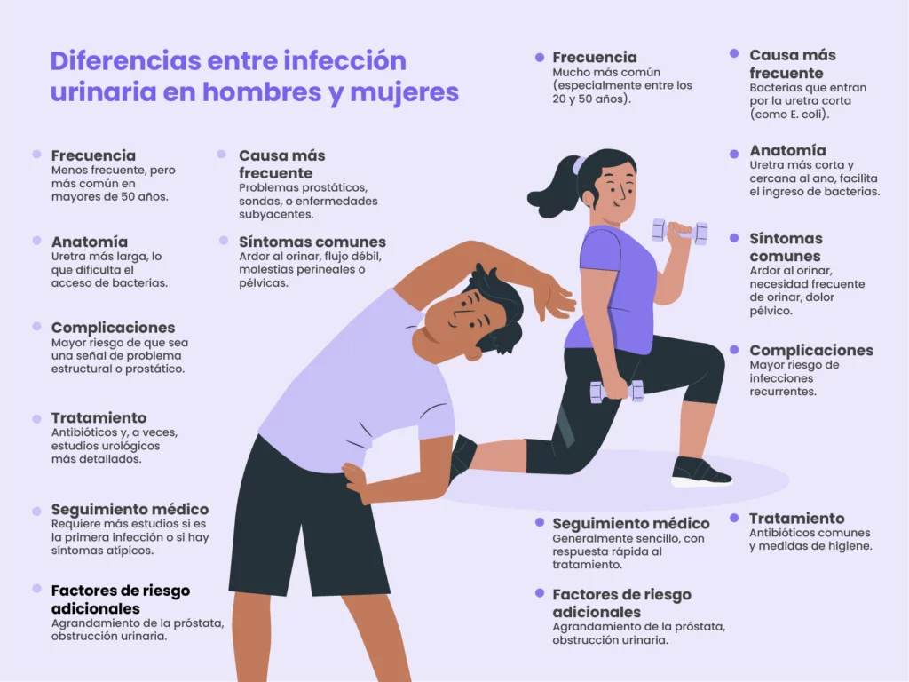 En las mujeres, la ITU es más frecuente debido a su anatomía. En los hombres, suele estar relacionada con problemas en la próstata o enfermedades crónicas. Aunque los síntomas pueden ser similares, en hombres tiende a ser más grave y requiere estudios adicionales para descartar complicaciones.